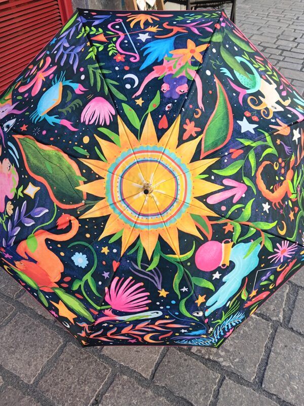 « Hello ! Je suis La Jeannette alias Marion, illustratrice passionnée qui vit au cœur des montagnes auvergnates où je développe des illustrations singulières et colorées. Mon univers graphique évolue autour d’un monde onirique et merveilleux. Avec ce parapluie, je vous emmène dans mon univers où s’entremêlent rêve et réalité ! »